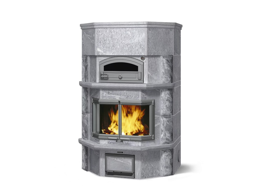 Tulikivi’s top of the line fireplace/bakeoven. The sides of the fireplace are decorated with a cut surface. The Tulikivi fireplace/bakeoven adapts smoothly to the space. The bakeoven is on the kitchen side and the large bay-style door of the firebox opens into the living room.